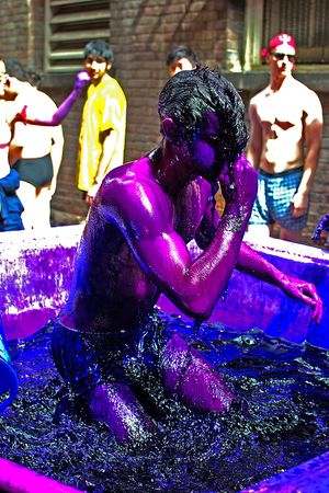 A brave F!rosh jumping into the purple dye, 2013.