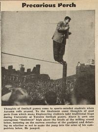 At the University of Toronto, engineers from the School of Practical Science were known to be active participants at football games and had taken on the role of valiantly defending goal posts from attacking visitors during post-game festivities.[2] On other occasions, engineers had been known to assist in the toppling of their own goalposts.[3]