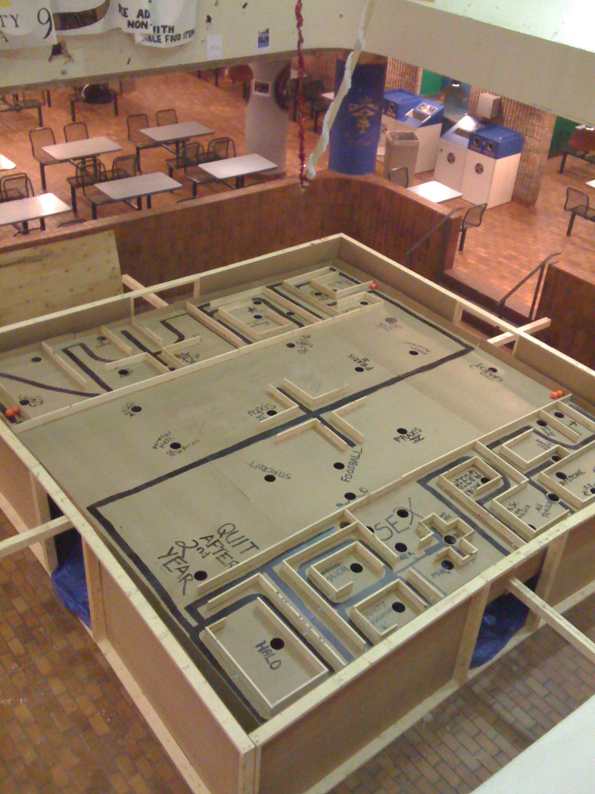 Engineering Science grad prank in 2009, a giant labyrinth setup in the SF Atrium. The prank was subsequently destroyed by the MIEs for their Iron Ring party (which was held in the Atrium), and rebuilt almost exactly as it was. (Pictured is the second version after reconstruction)